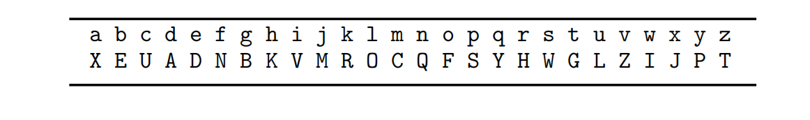 在位移密码中,明文字母表与密文字母表的映射关系是由密钥确定的固定位移。在单字母替换密码(也称单表位移密码)中我们可以为明文字母表和密文字母表建立一一对应的关系。如下关系: