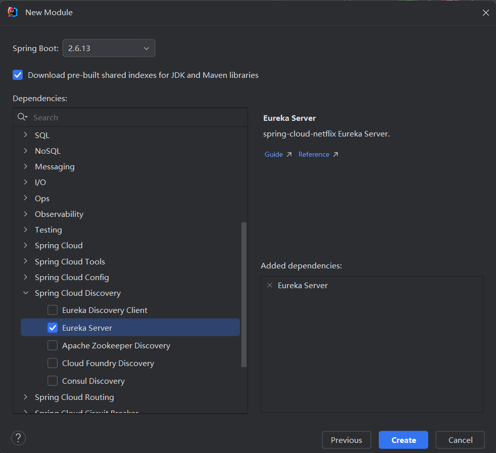 在主工程下创建一个名为 cloud-eureka-7001 的 Spring Boot Module 作为服务注册中心,可以直接选择eureka-server依赖快速构建,或者并在其 pom.xml 中引入以下依赖。