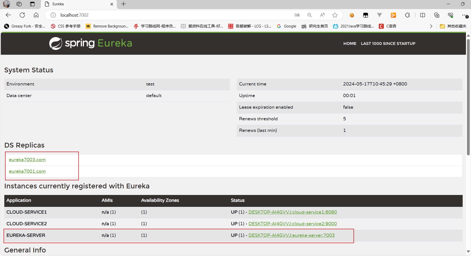 然后全部启动服务,这里以打开端口为7002的eureka服务为例http://localhost:7002/,可以看到集群已经搭建成功。